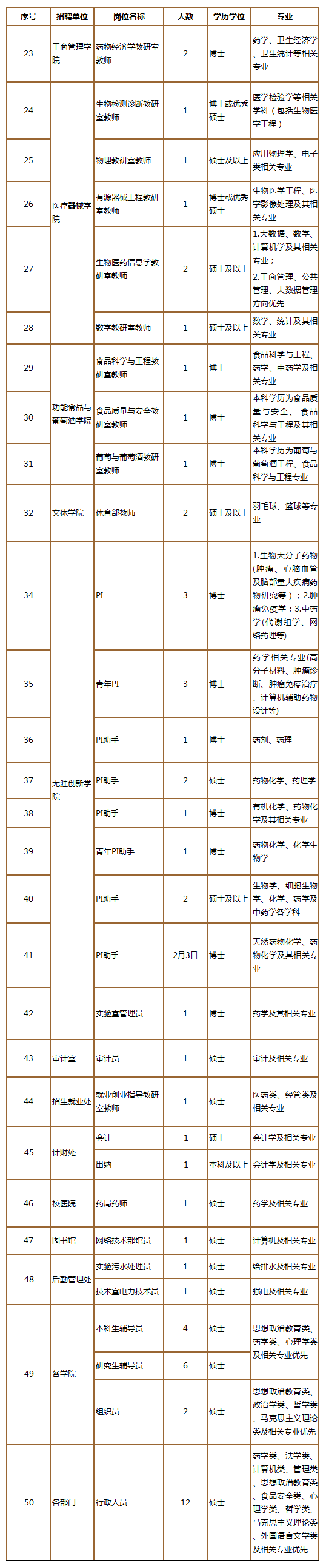 沈阳药科大学是一所以药为主,覆盖医、工、理、管、经5个学科门类的多学科、多层次、多形式教育的高等药学学府,是辽宁省“双一流”重点建设高校。因工作需要,我校拟面向社会招聘教师、教辅、辅导员、行政人员各类岗位人员。现将我校2021年用人计划予以公布,诚挚欢迎各位同仁加盟药大,共谋发展!