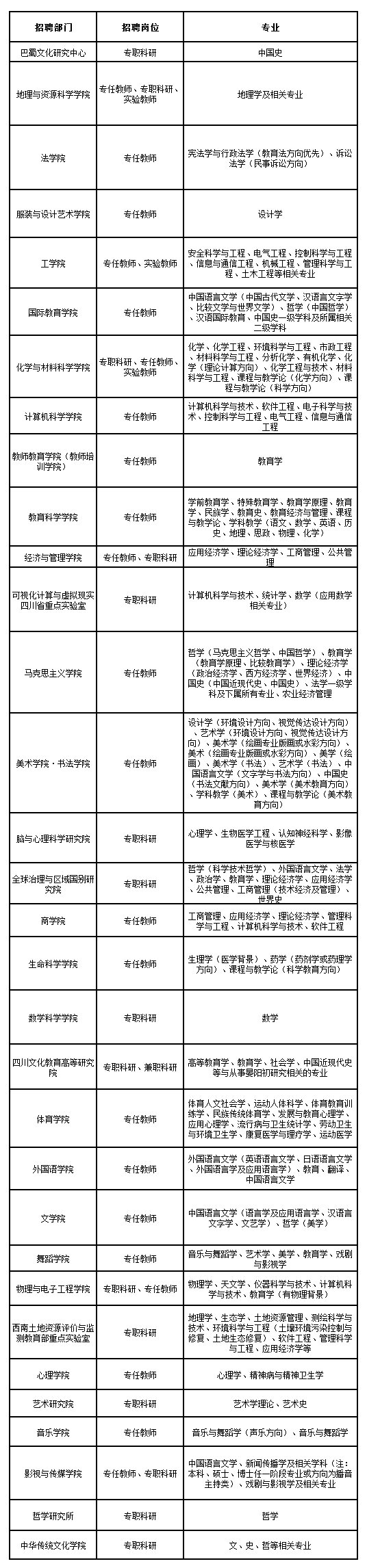 四川师范大学2021年招聘博士岗位和条件要求一览表