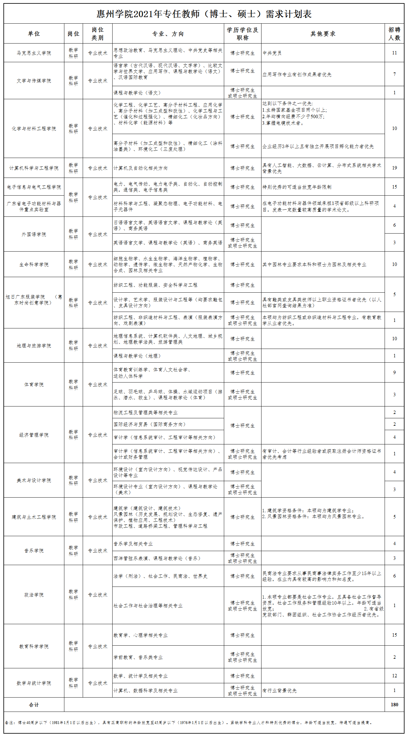 详见《惠州学院2021年专任教师(博士、硕士)引进需求表》(附件1)。