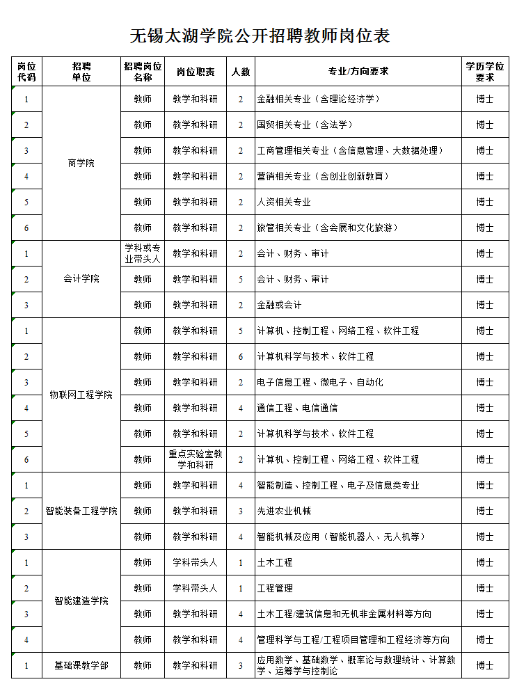 商学院教师、会计学院教师、物联网工程学院教师、智能装备工程学院教师、智能建造学院教师、基础课教学部教师。(具体条件及要求参见附件:无锡太湖学院公开招聘工作岗位表)