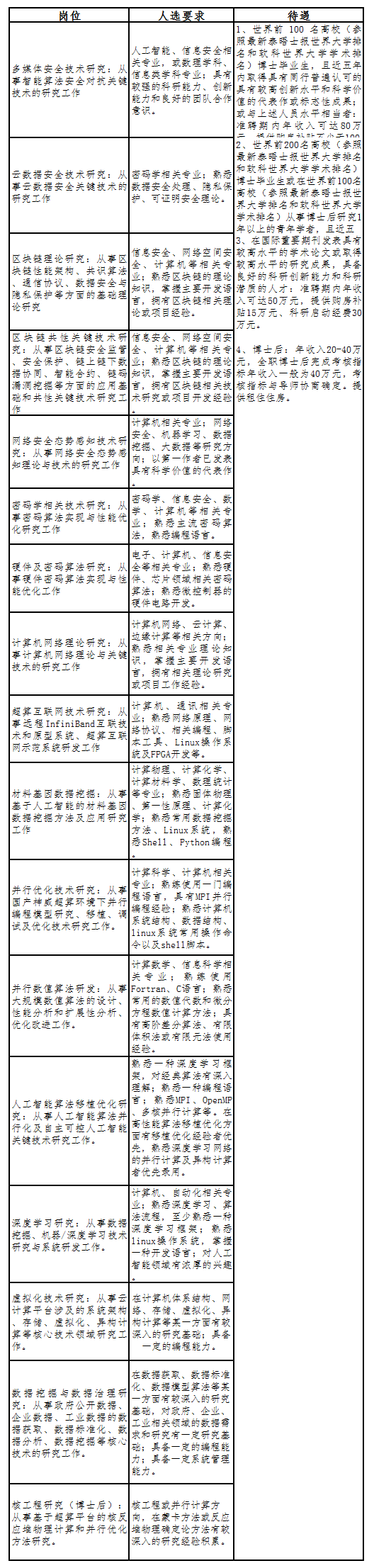 高性能计算、并行计算、计算数学、人工智能、大数据、云计算、计算机网络、网络边缘计算与智能、新型网络流量工程、密码应用、数据安全与隐私保护、网络安全态势分析、区块链基础理论与共性关键技术、多媒体信息安全与智能算法安全对抗、超算互联网、基础数学库、资源调度与管理、数据治理与数字经济、核工程等研究方向。