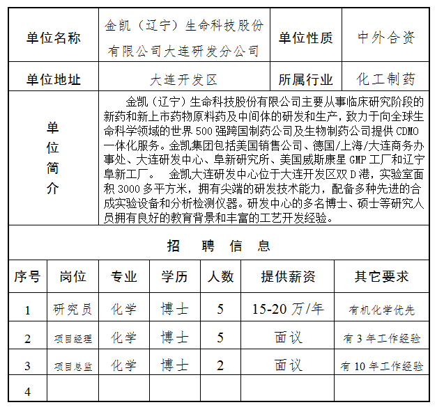 金凯(辽宁)生命科技股份有限公司大连研发分公司招聘简章